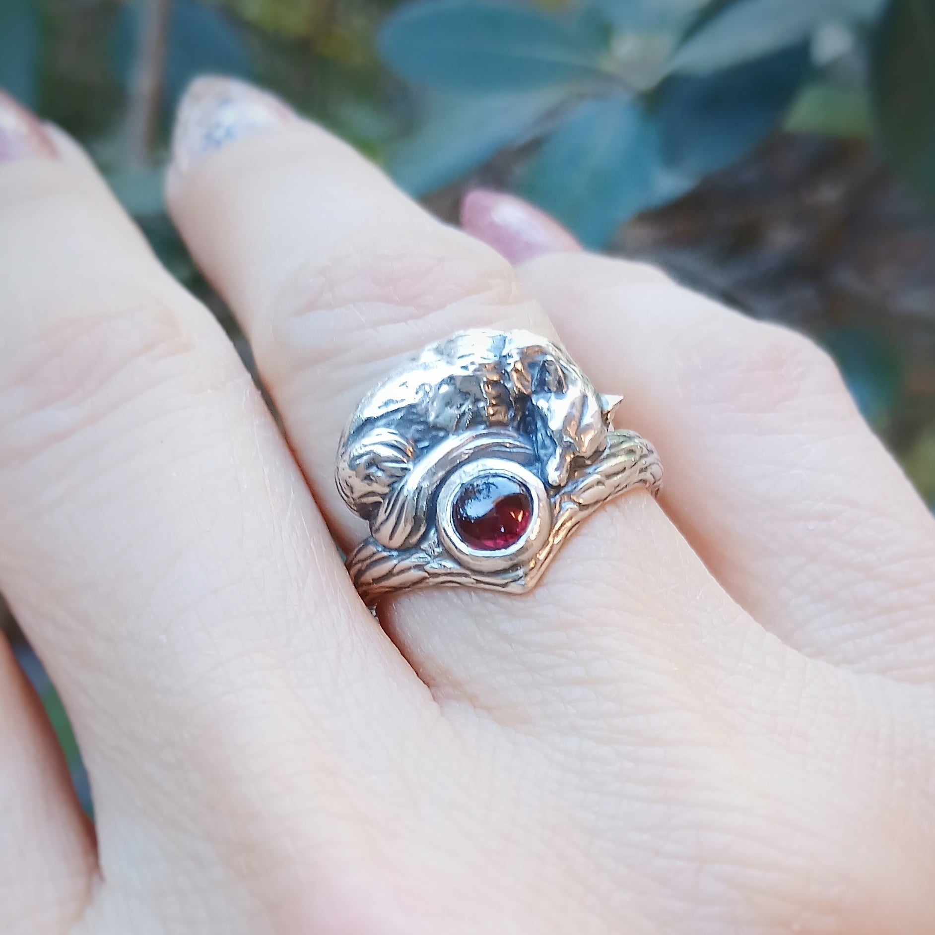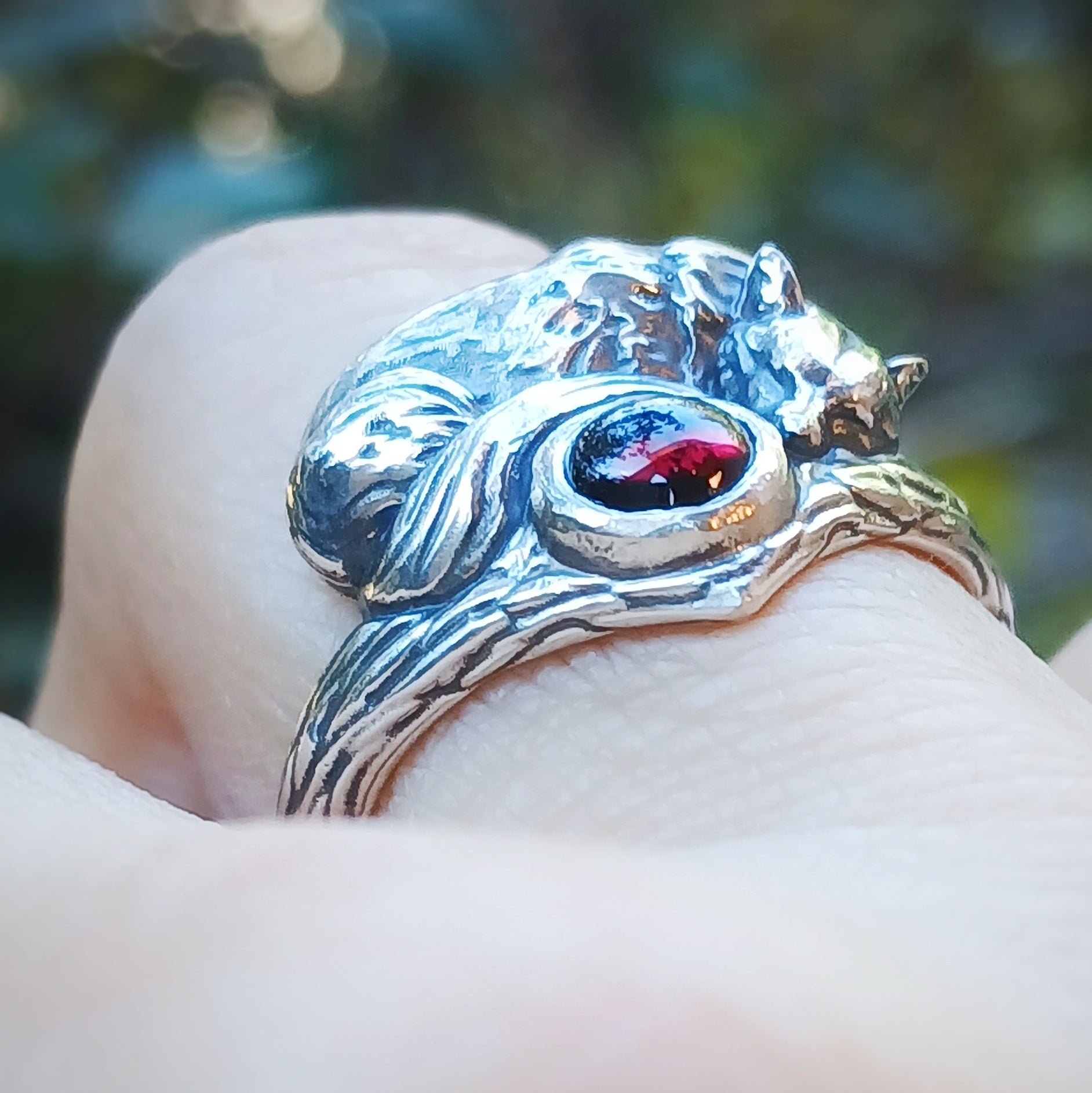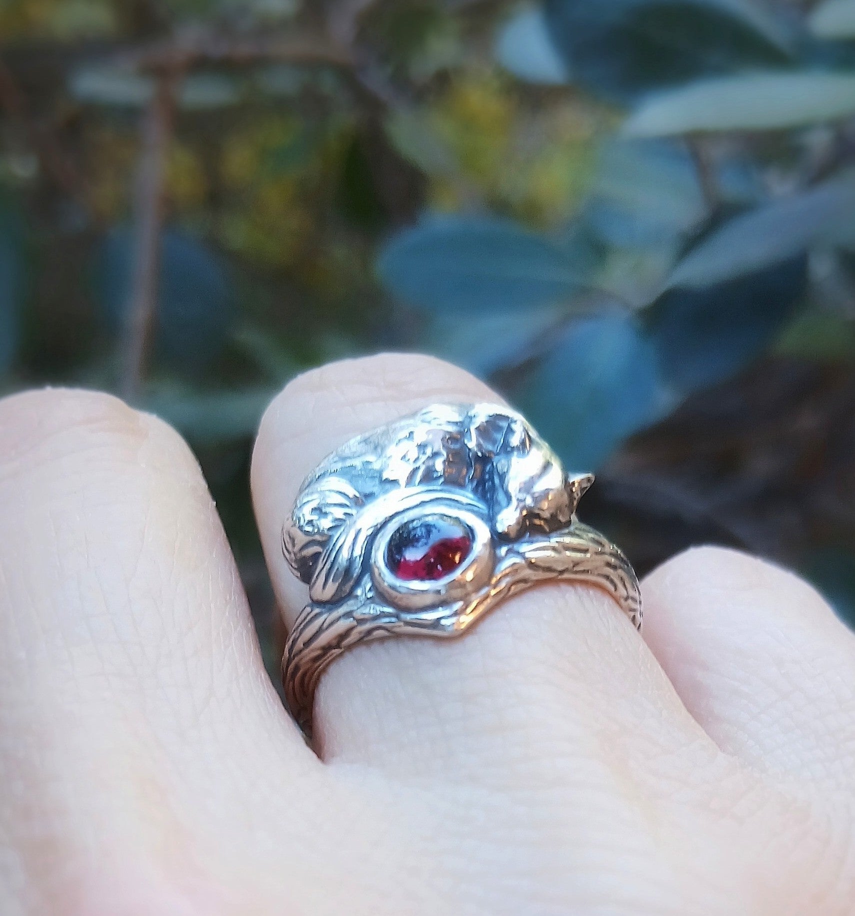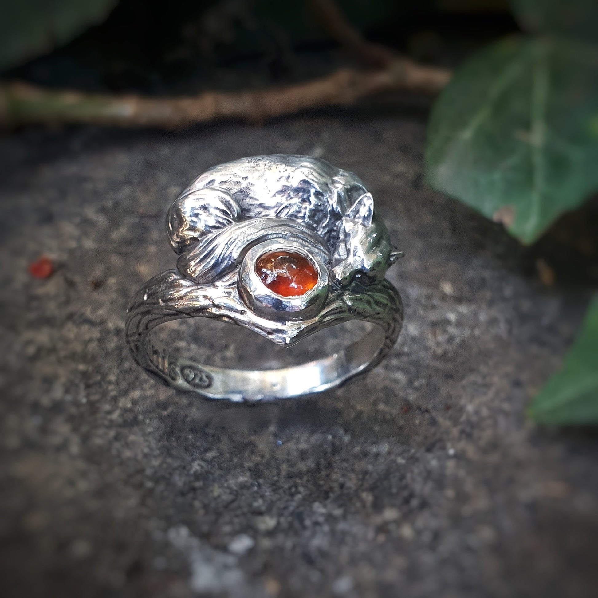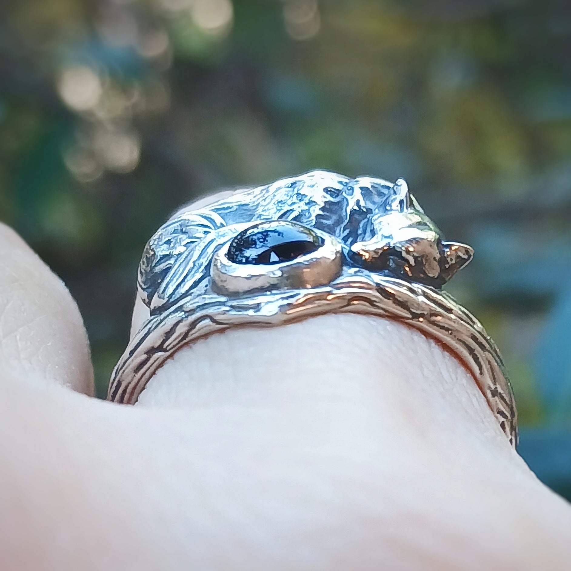 Questo anello artigianale in argento 925 mostra una volpe addormentata, raccolta su una fascia che richiama un ramo levigato, con piccole irregolarità che sembrano segnare il passaggio delle stagioni. La gemma cabochon personalizzabile riposa al centro come un nucleo quieto, accolto tra le curve del corpo della volpe. Le superfici scolpite suggeriscono un frammento di bosco essenziale, privo di ornamenti superflui, dove ogni linea ha il sapore di qualcosa che esiste da sempre. L’intera scena trattiene un silenzio morbido, una protezione discreta che non chiede attenzione ma la offre.